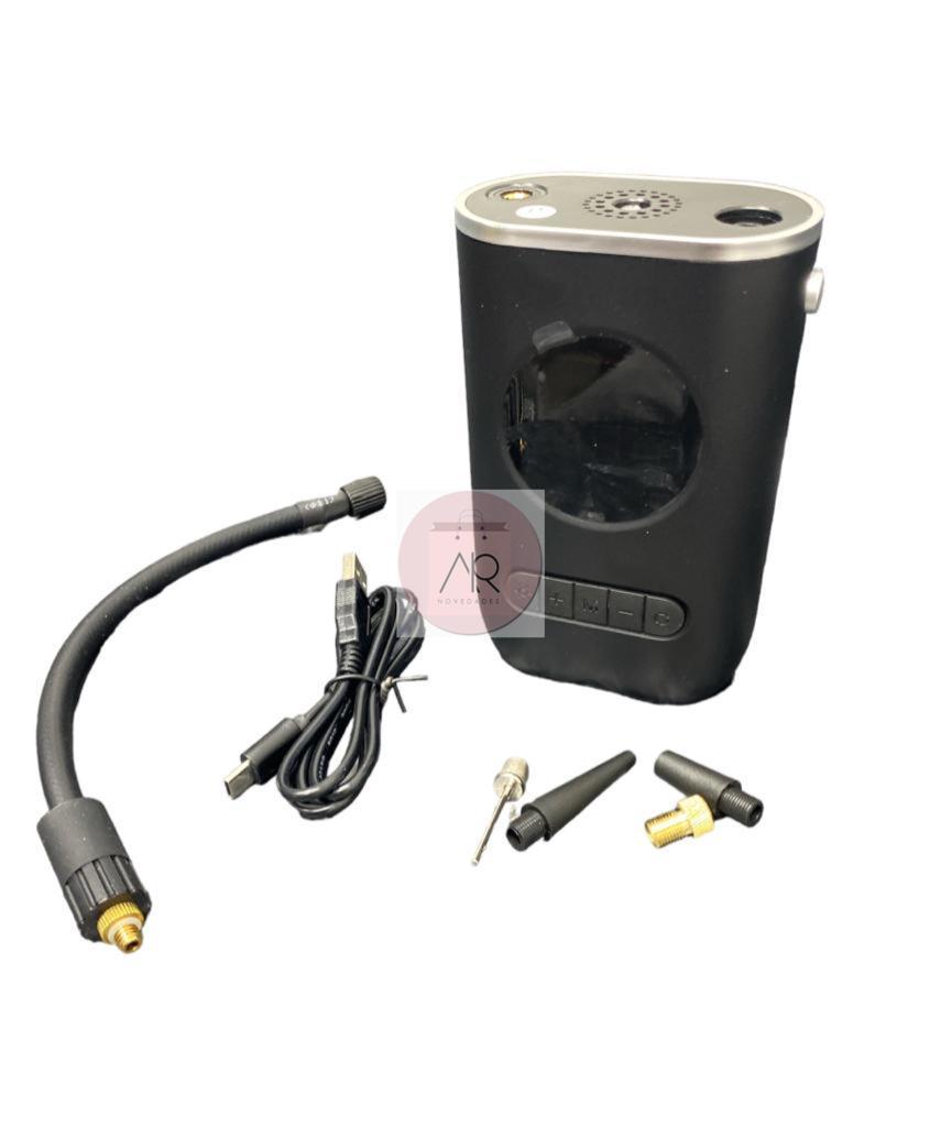 Especificaciones TécnicasCaracterísticaDetallePantallaDigital LCD con retroiluminaciónPresión máxima150 PSI (10.3 Bar aprox.)Presión ajustableSí, con parada automática al llegar al valor configuradoBatería interna2000 mAh o 4000 mAh (según modelo)Tiempo de carga3 a 4 horas (USB tipo C o micro USB)Tiempo de trabajo continuo20–30 minutos aprox.Unidades de presiónPSI, BAR, KPA, Kg/cm²Flujo de aire15–25 L/min (según modelo)Luces LEDSí, luz blanca para emergencia o trabajo nocturnoRuido≤ 80 dB🔌 Alimentación y cargaEntrada de carga: 5V / 1A o 2A (USB)Tipo de puerto: USB-C o Micro-USB (según versión)Modo de uso: Totalmente inalámbrico tras carga completa📦 Contenido del paquete típico1 Compresor portátil1 Manguera de aire1 Cable de carga USB3–4 boquillas adaptadoras:Para balonesPara bicicletas (válvula presta)Para inflables (colchones, juguetes)Para autos y motos (válvula estándar Schrader)Manual de usuario✅ Funciones adicionalesApagado automático al alcanzar presión objetivoMemoria de última configuraciónLuz LED de emergenciaPortátil y liviano: cabe en la guantera o mochila📏 Dimensiones y peso (estimado)Tamaño: 15–18 cm de alto x 6–8 cm de anchoPeso: 350 – 600 g (dependiendo de batería y materiales)📍 Usos recomendadosNeumáticos de autos y motosBicicletas de ruta o montañaBalones deportivosColchones inflables, flotadores, juguetes inflables